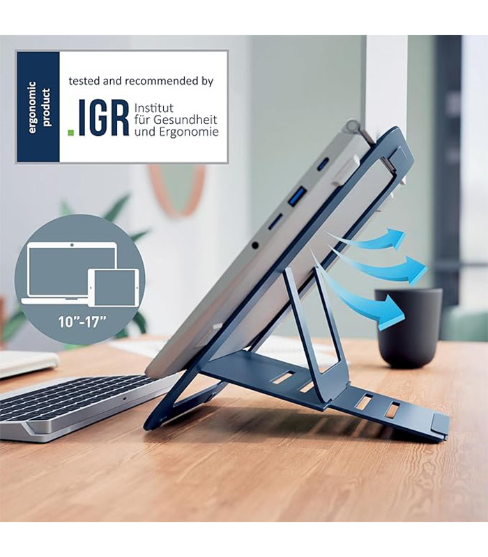 - Comes with a cotton pouch to keep the foldable laptop riser protected when not in use; the laptop stand is tested and recommended by the German IGR Institute for Health and Ergonomics, according to DIN 26800 EN ISO 15537