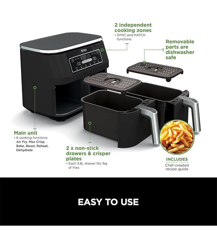 Includes – Air fryer, 2 drawers, recipe guide; Black, 8.2kg